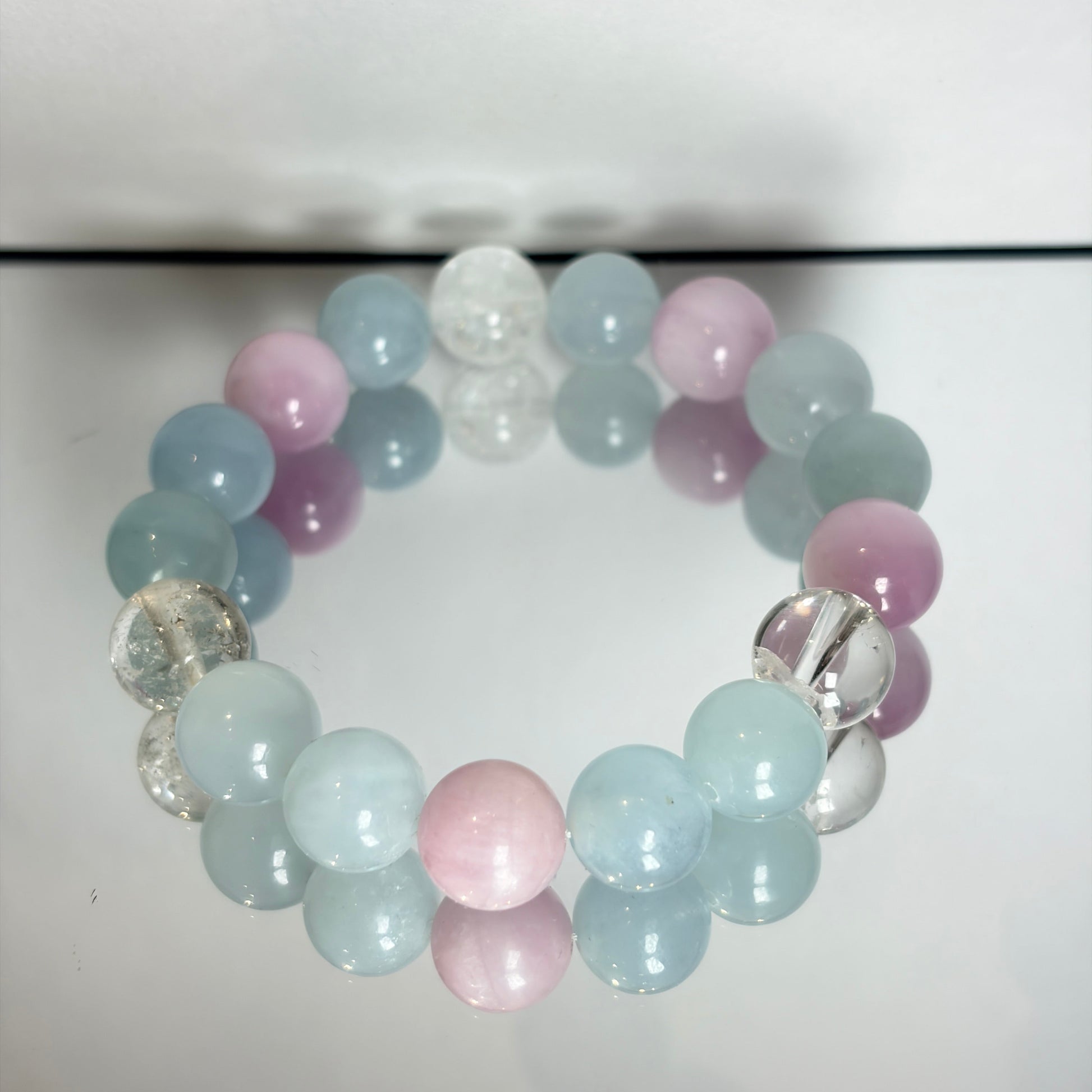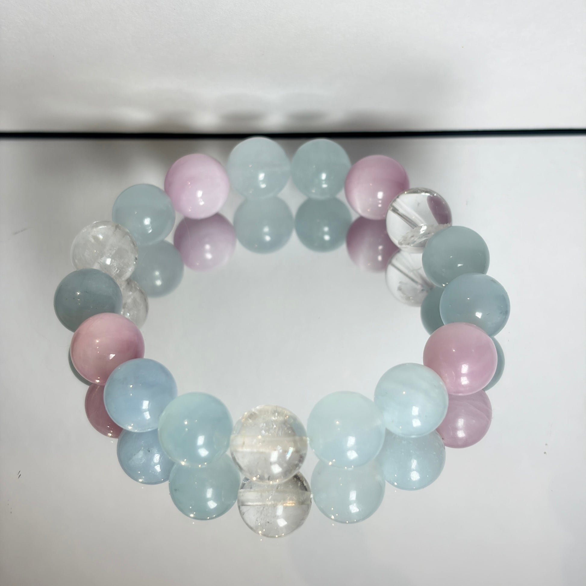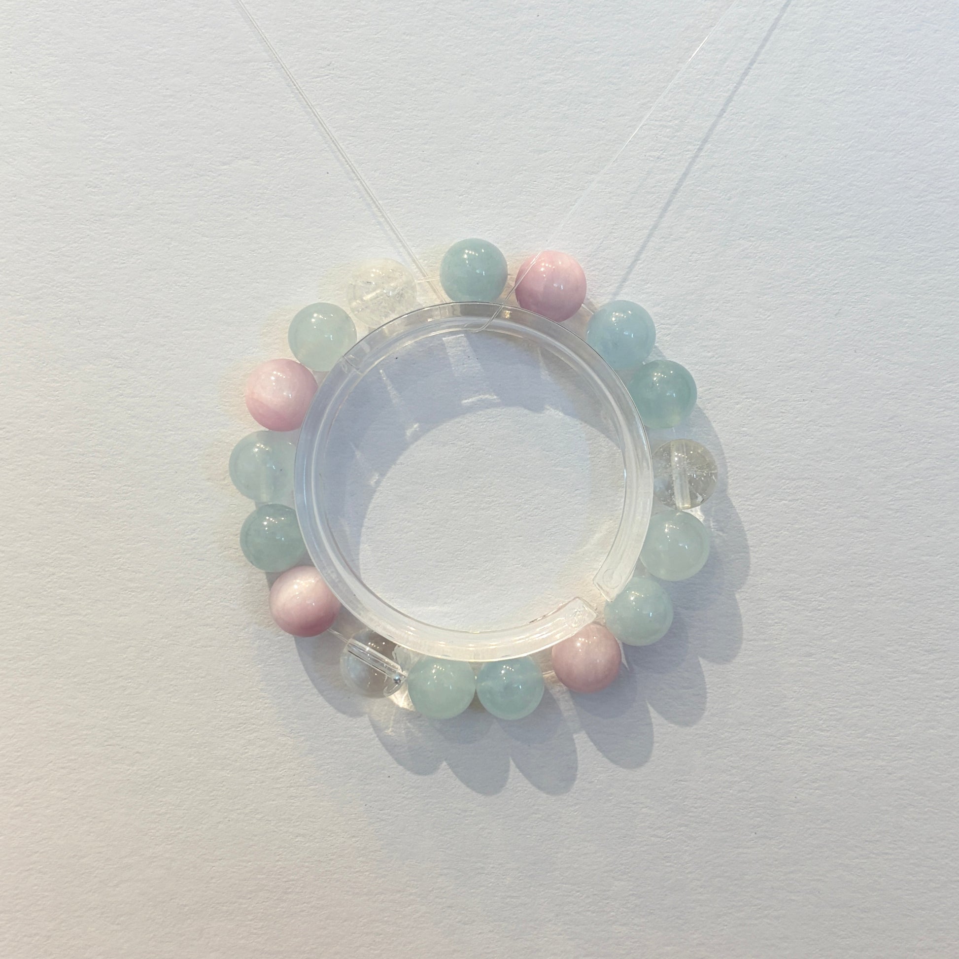 Aquamarine, Kunzite, and Clear Quartz Phantom blend into a soothing pastel palette, creating a calm, baby-soft energy that feels light and reassuring.