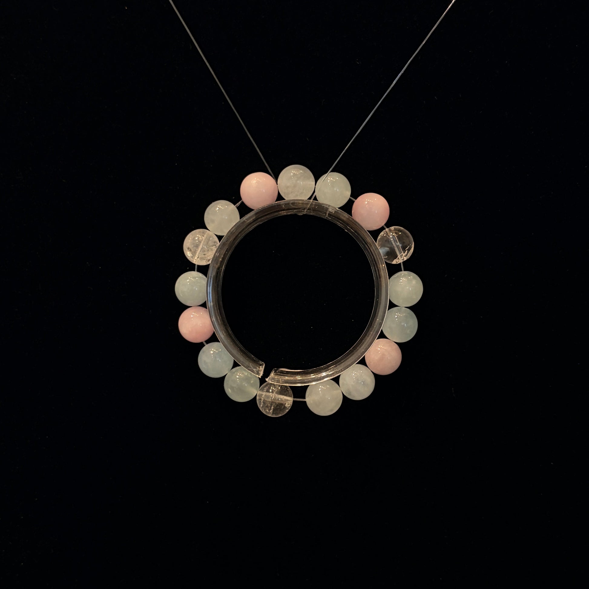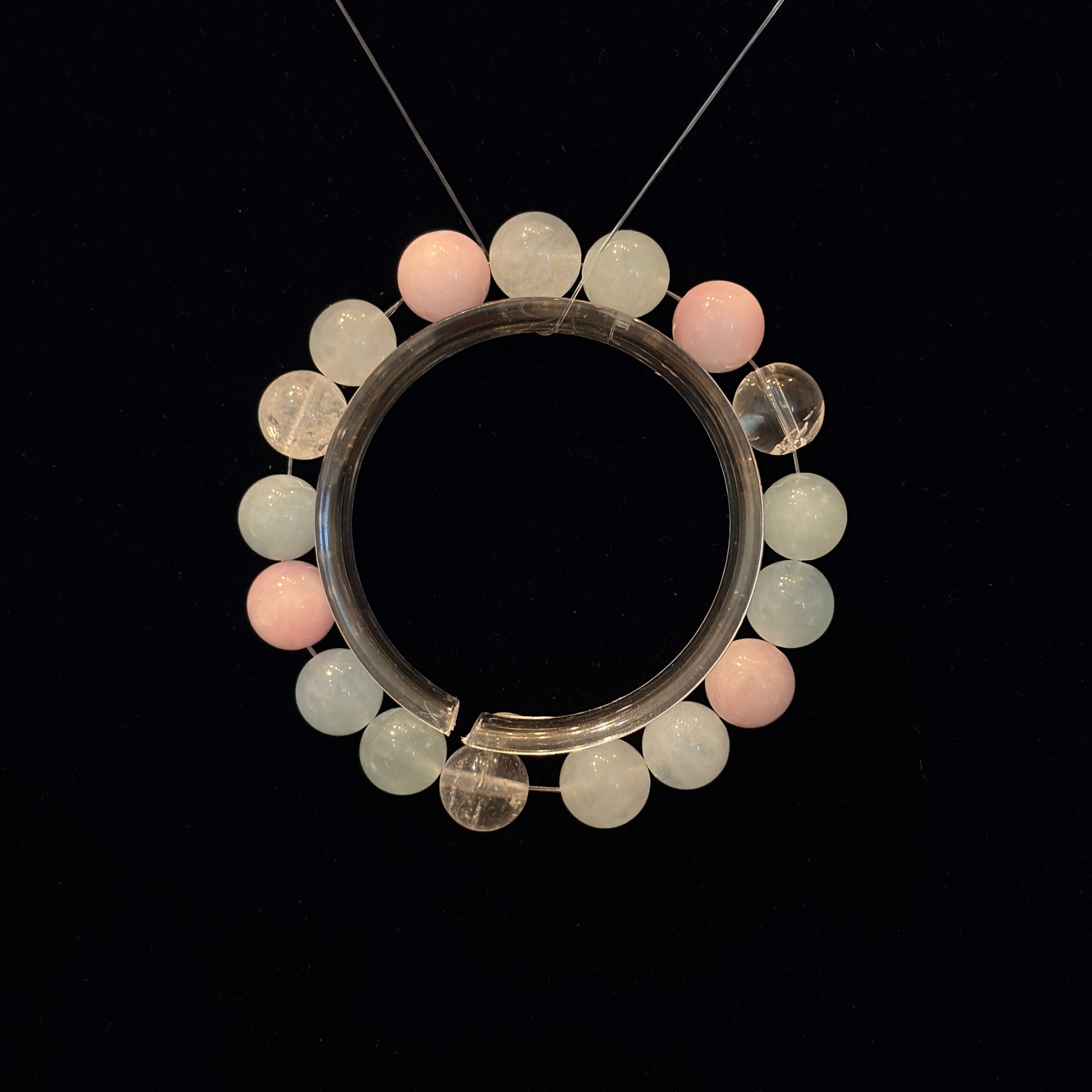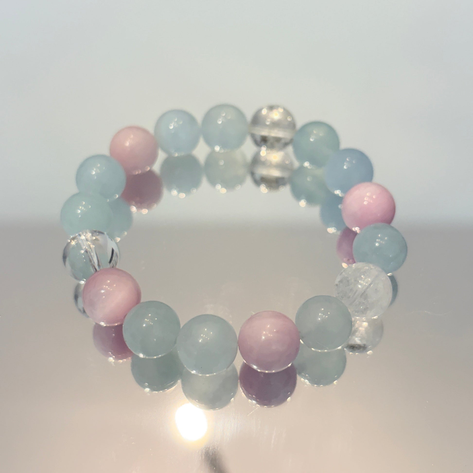 Aquamarine, Kunzite, and Clear Quartz Phantom blend into a soothing pastel palette, creating a calm, baby-soft energy that feels light and reassuring.