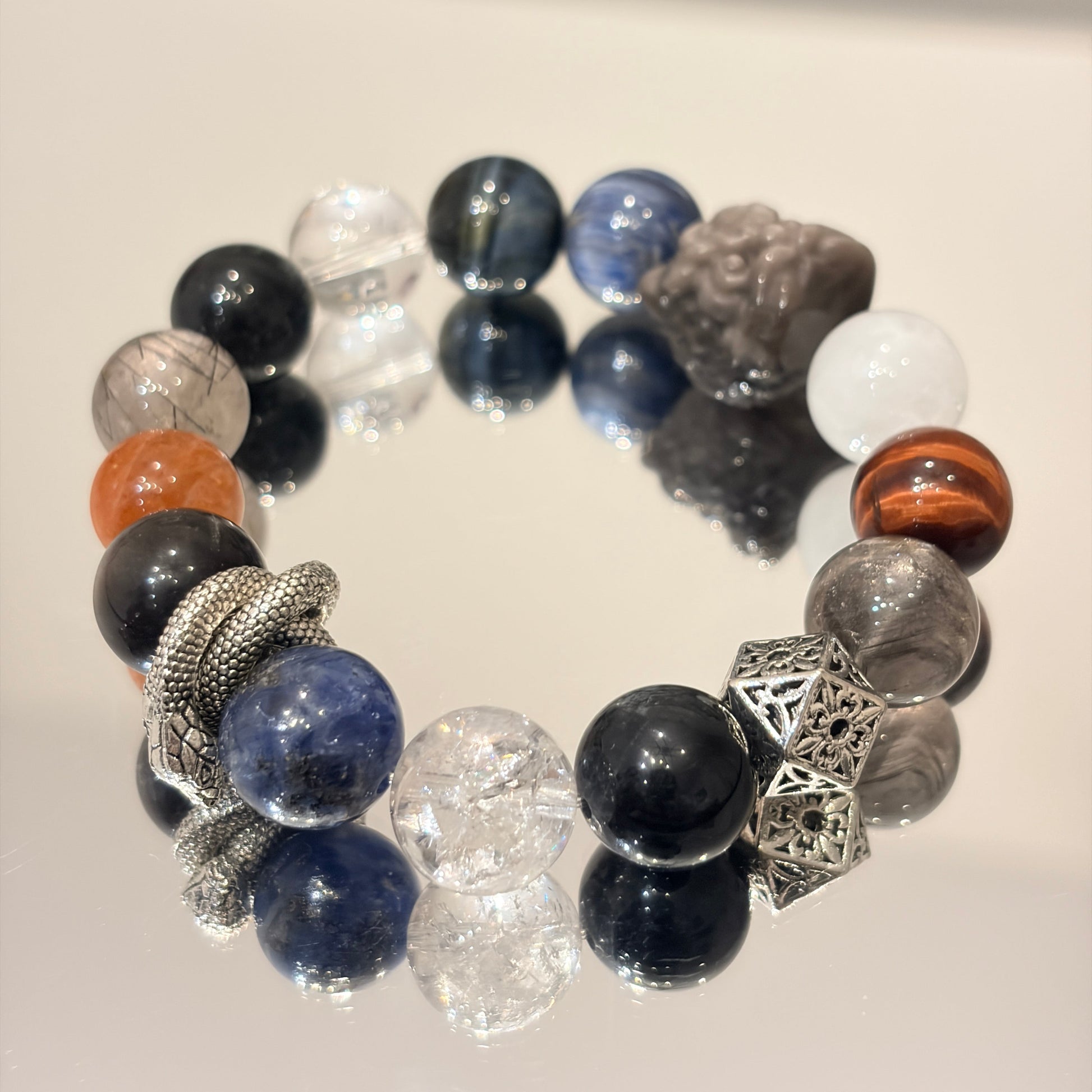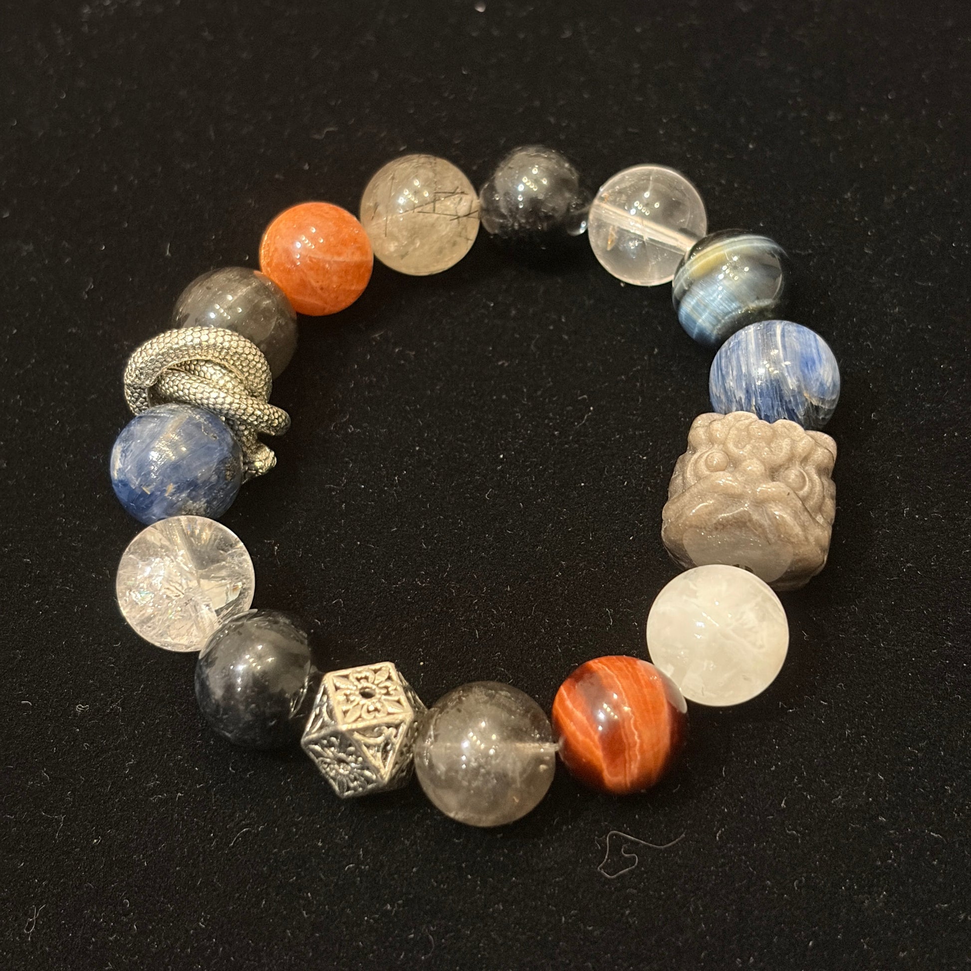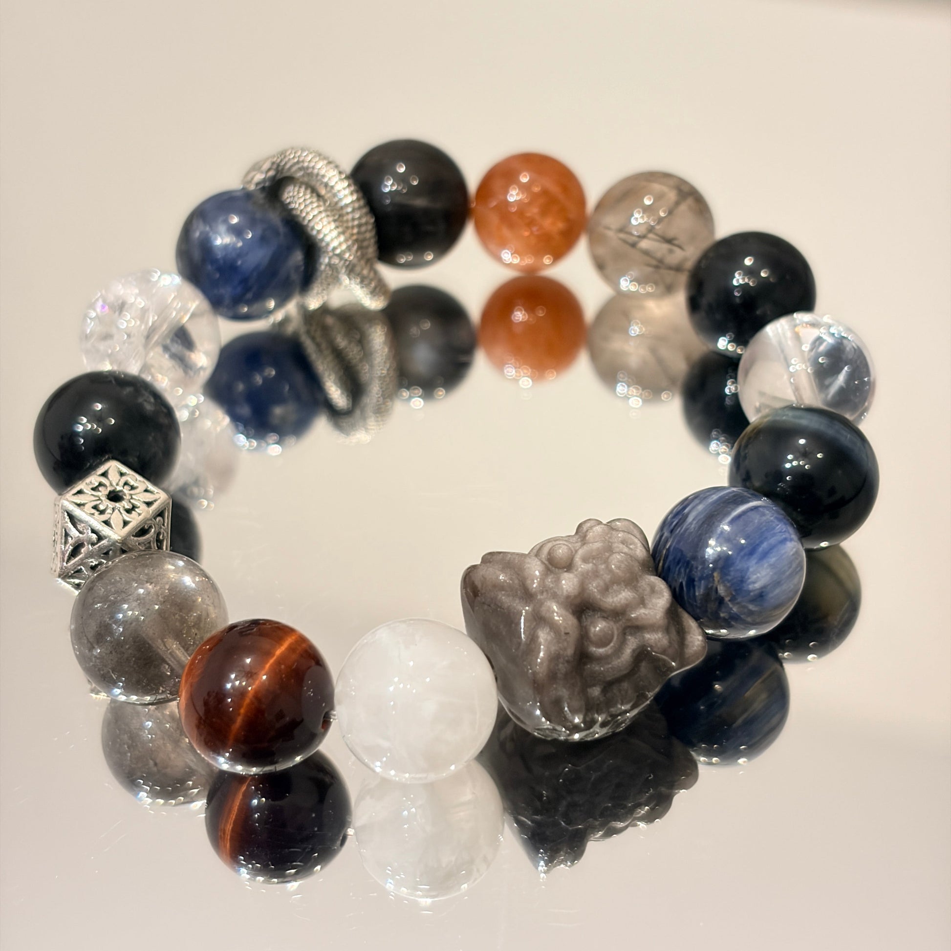 Accents of Golden Sunstone and Red Tiger’s Eye add warmth and contrast, giving the bracelet a striking focal point instead of a plain look.