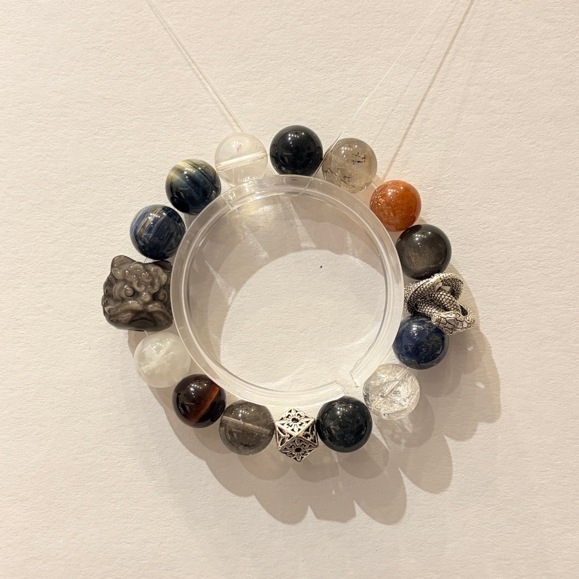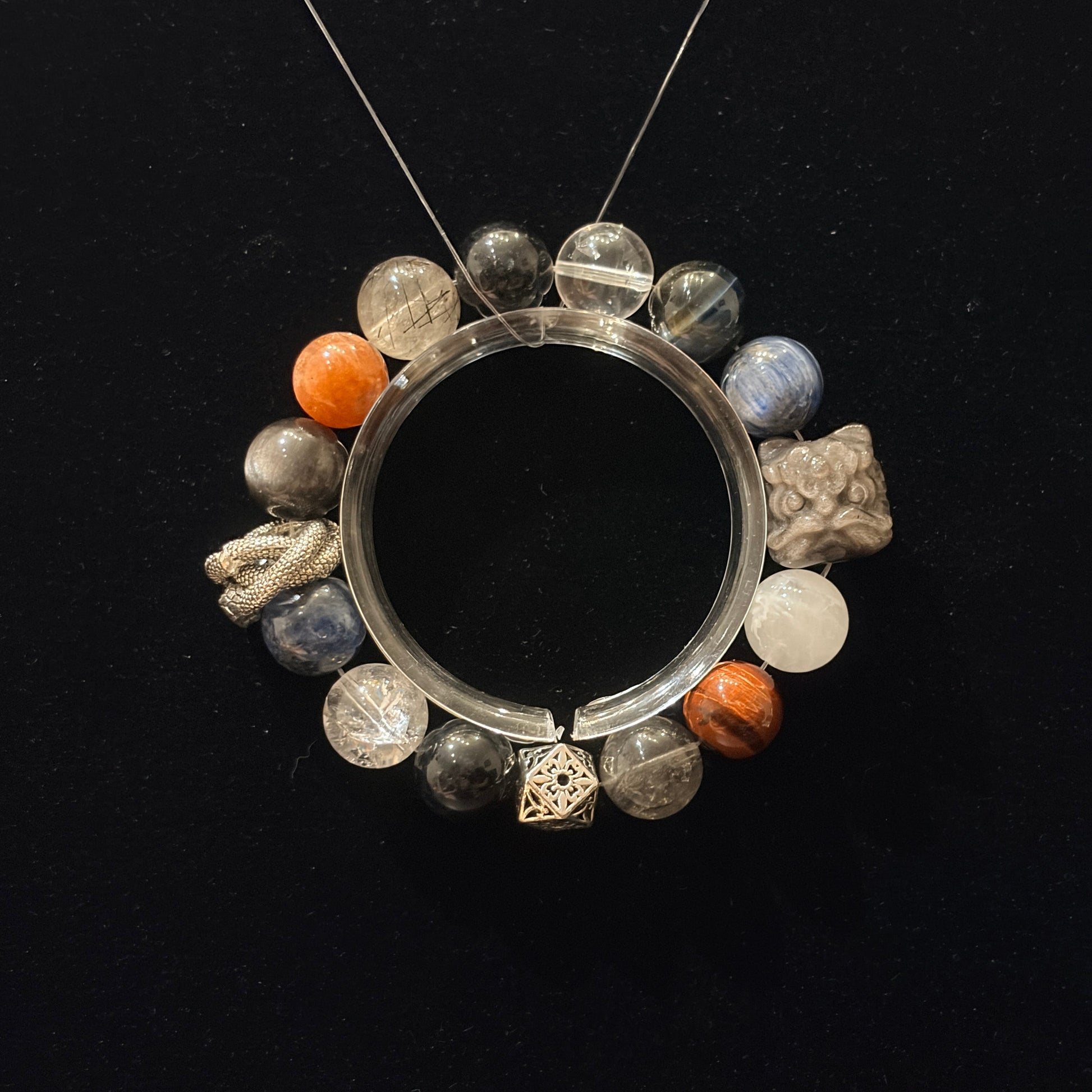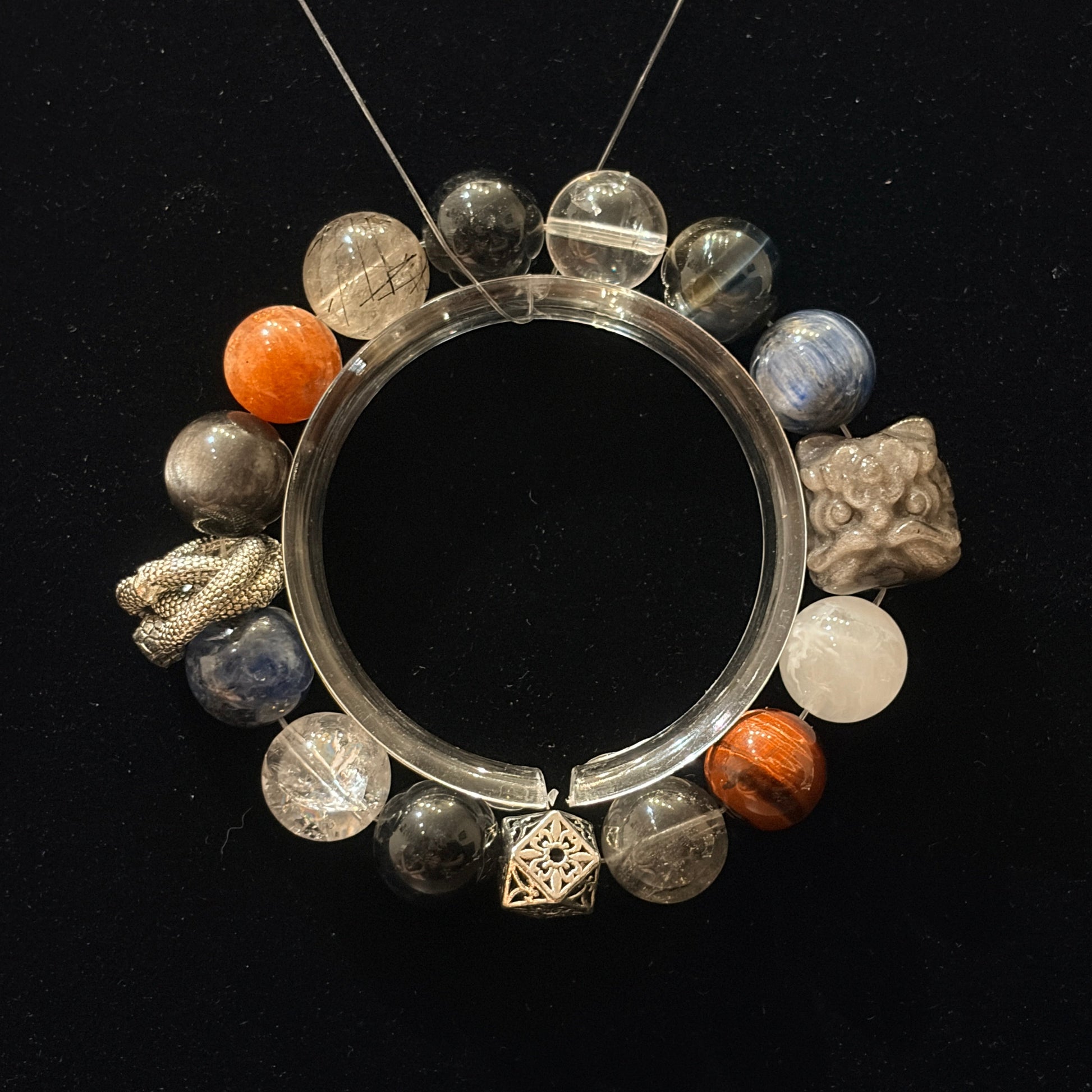 Accents of Golden Sunstone and Red Tiger’s Eye add warmth and contrast, giving the bracelet a striking focal point instead of a plain look.