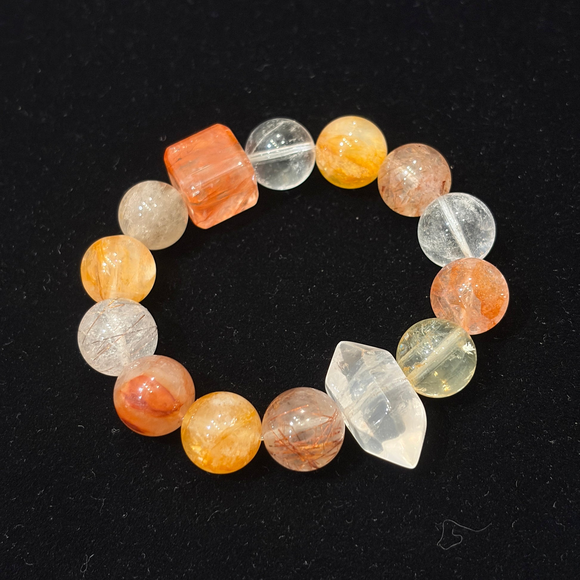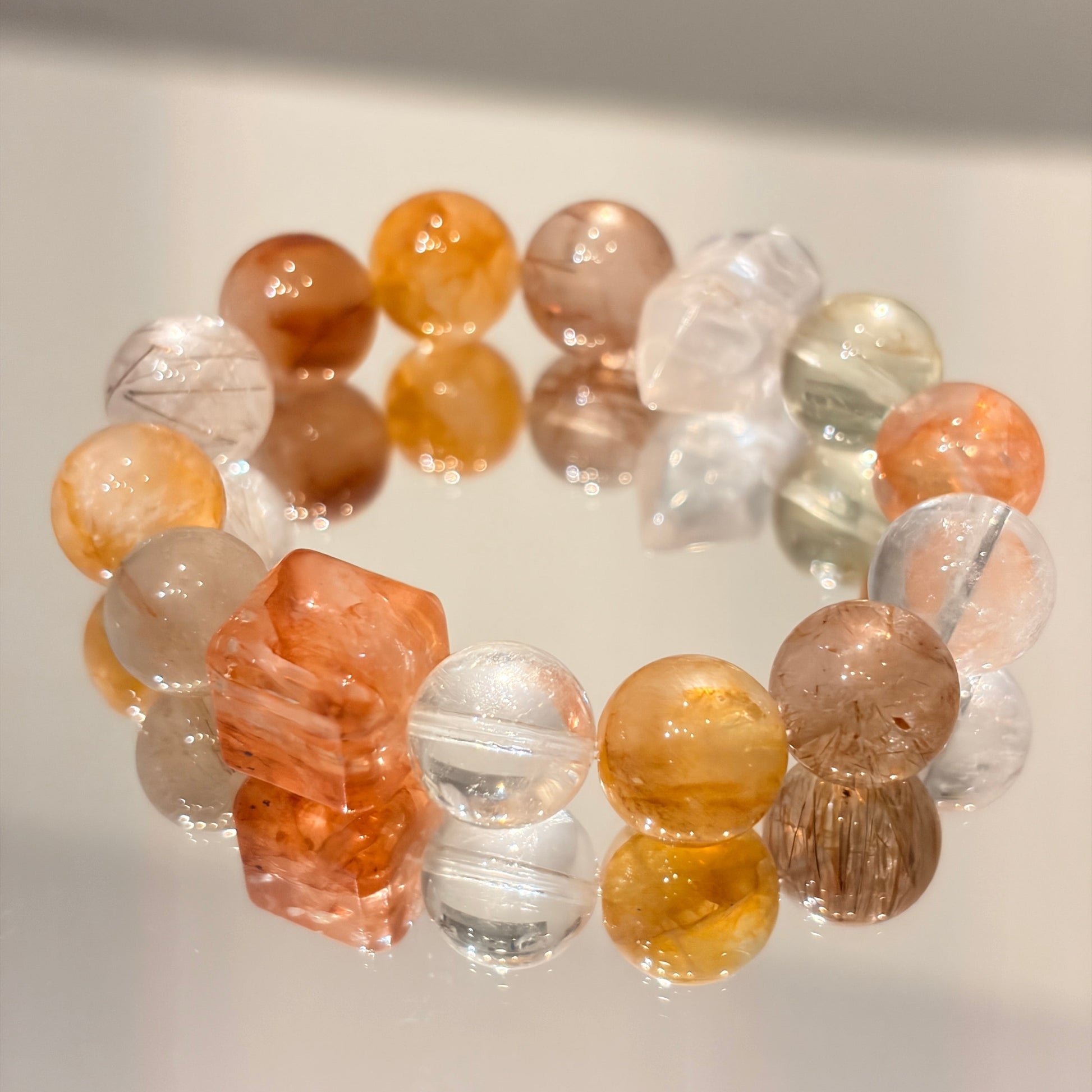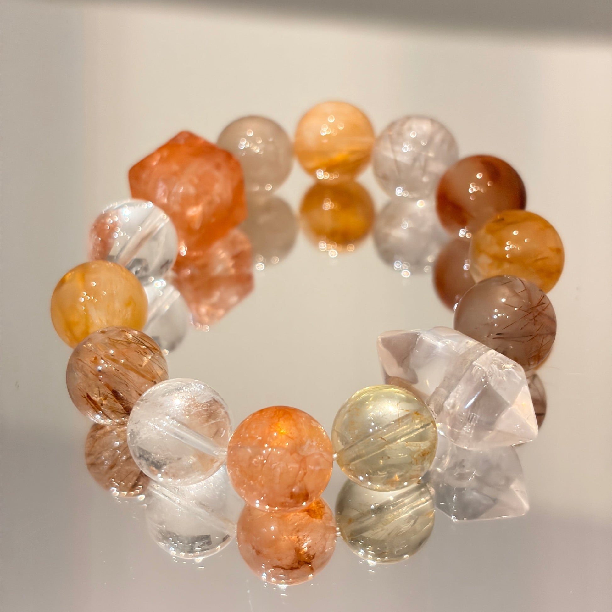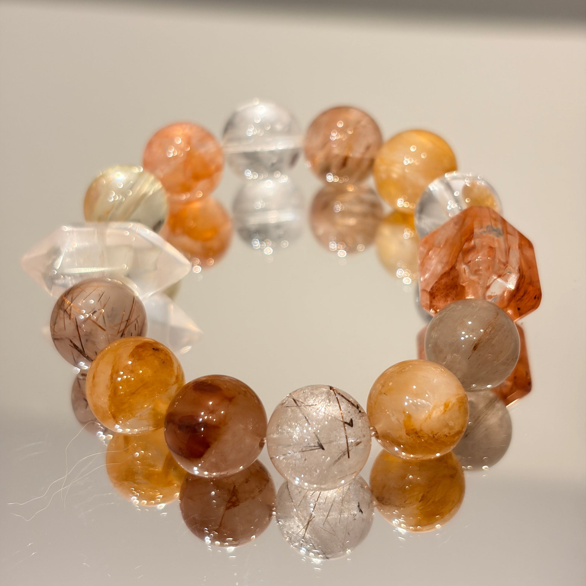 Featuring red floral beads, yellow floral beads, lemon citrine, red rutilated quartz, red rabbit hair crystal, and faceted clear quartz.