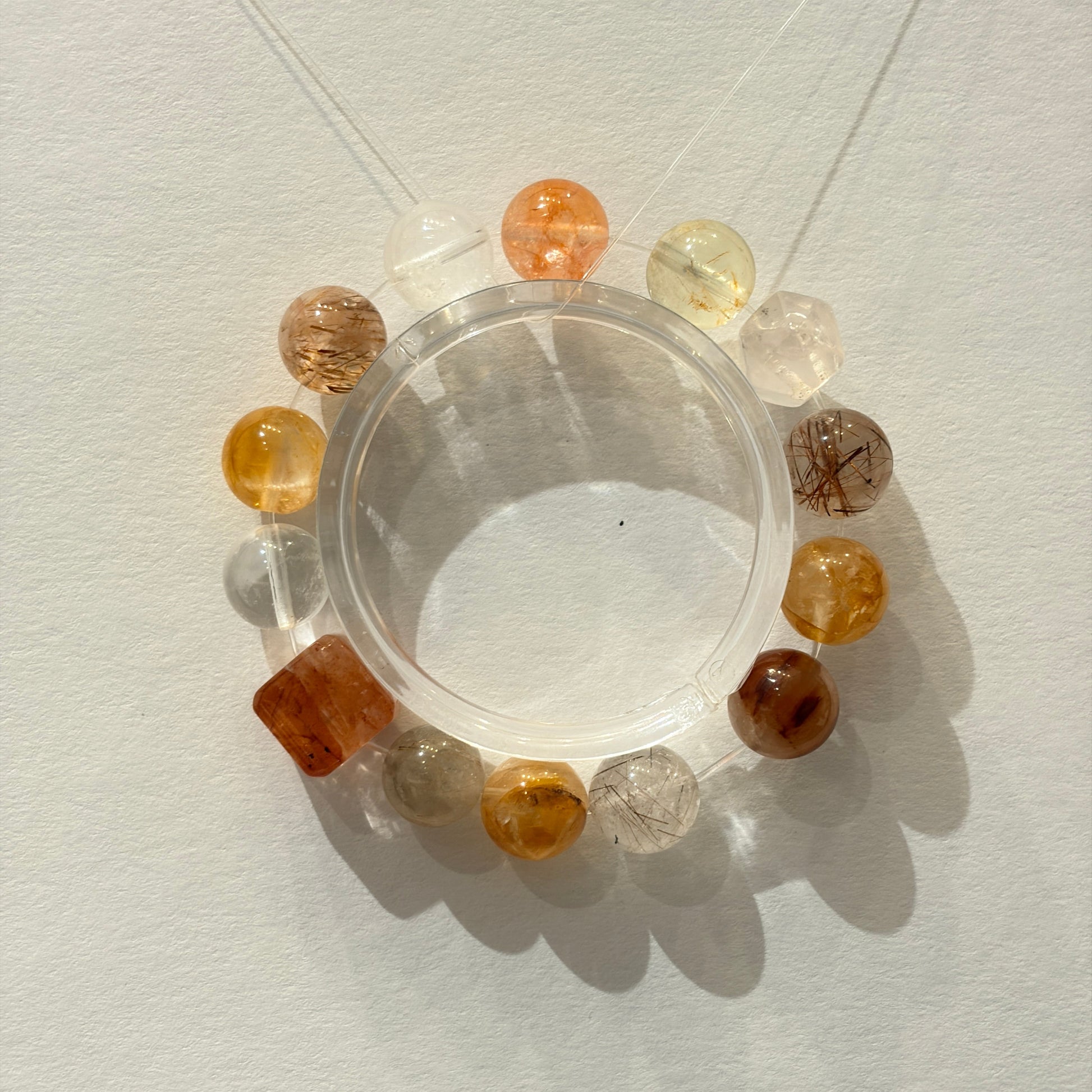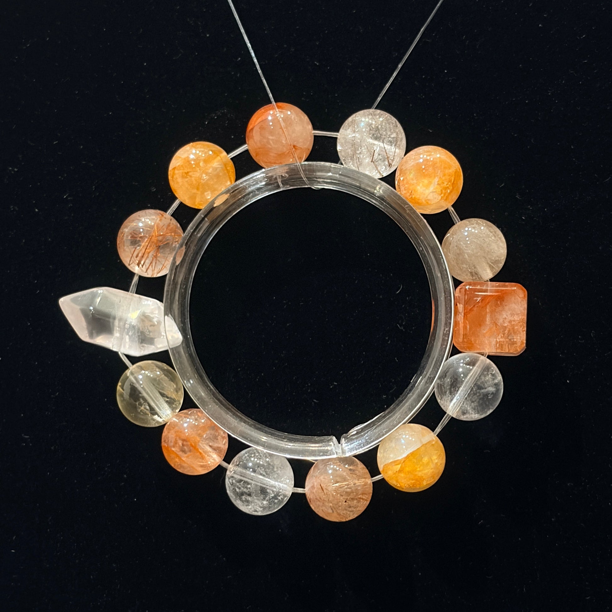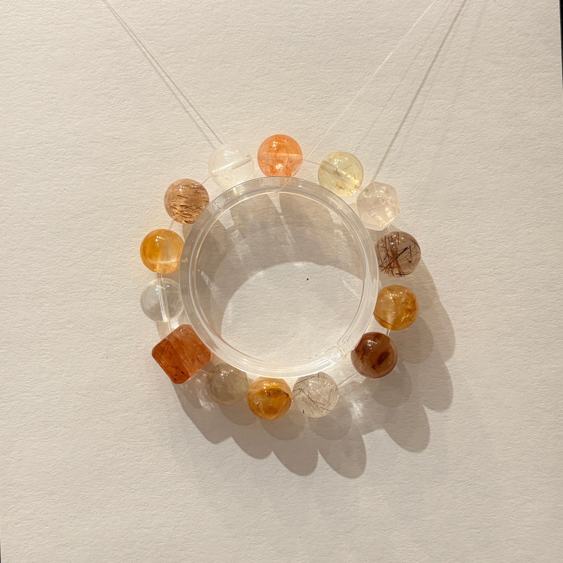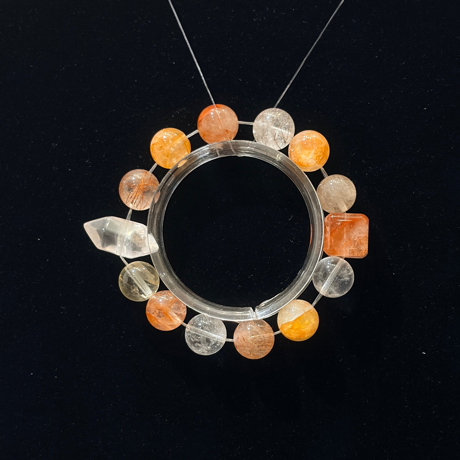 Featuring red floral beads, yellow floral beads, lemon citrine, red rutilated quartz, red rabbit hair crystal, and faceted clear quartz.